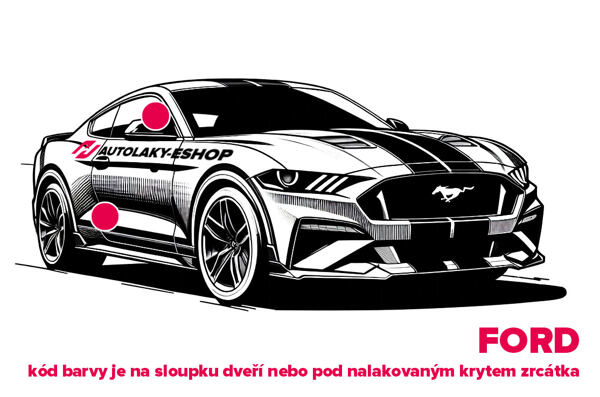 U vozů Ford najdete štítek s kódem barvy na sloupku dveří, nebo pod nalakovaným krytem zrcátka. V případě vozů značky Ford je ale jistější ověřit kód barvy podle VIN! S tím Vám mohou pomoci dealeři Ford nebo autorizované servisy, případně můžete poslat VIN nám.
