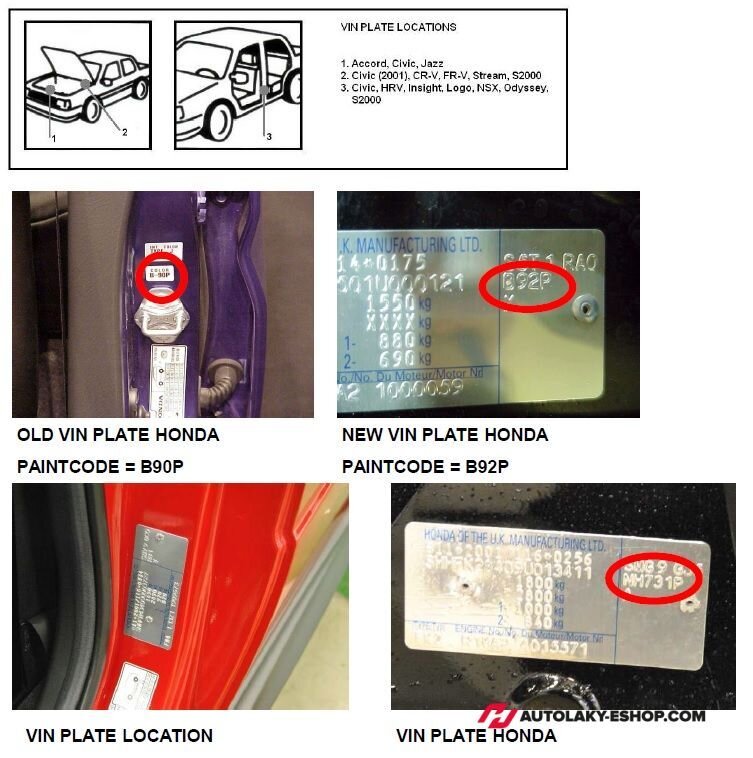 U Hondy najdete kód barvy na sloupku dveří řidiče nebo spolujezdce, také bývá někdy umístěn v motorovém prostoru.