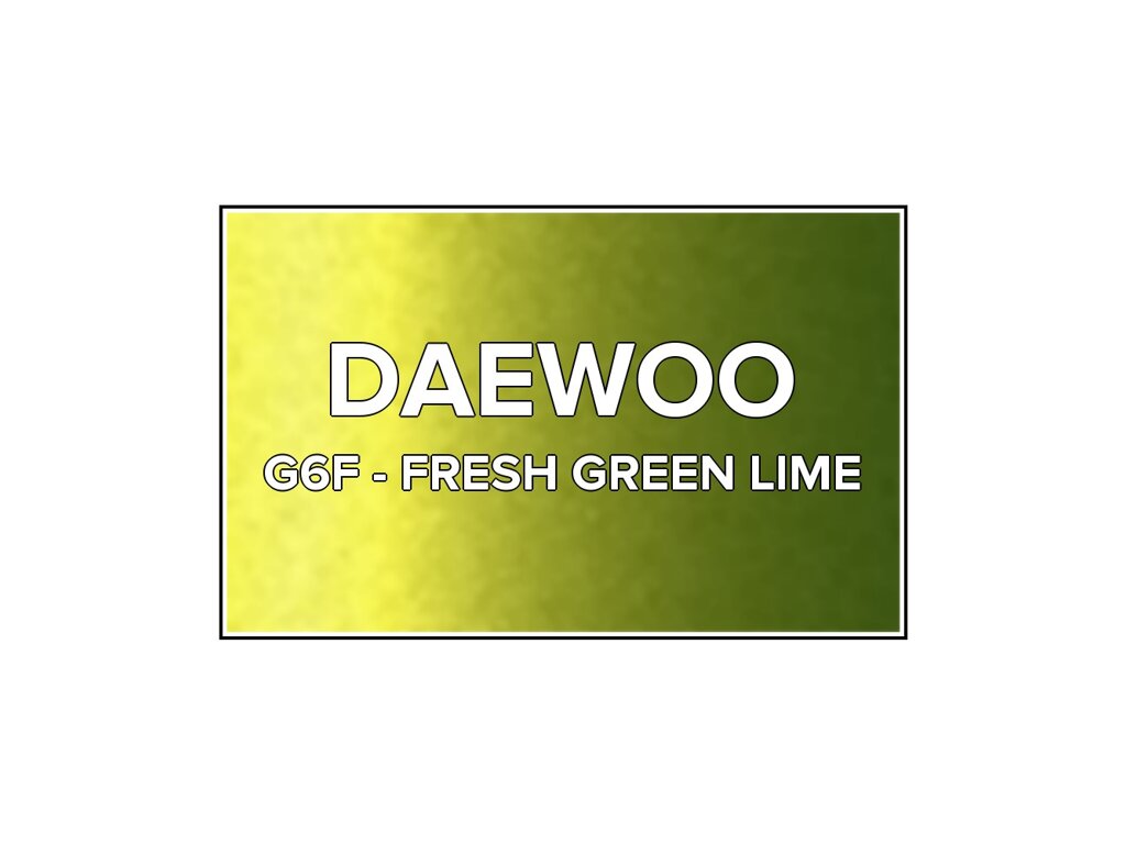 Přečíst článekZelená metalíza Daewoo G6F Fresh Green Lime ve spreji o objemu 400ml. Barva FRESH GREEN LIME přesně odpovídá autolaku G6F, používaného na vozech Daewoo v roce 2014. Barva na všechny povrchy, snadná aplikace, 100% krytí.