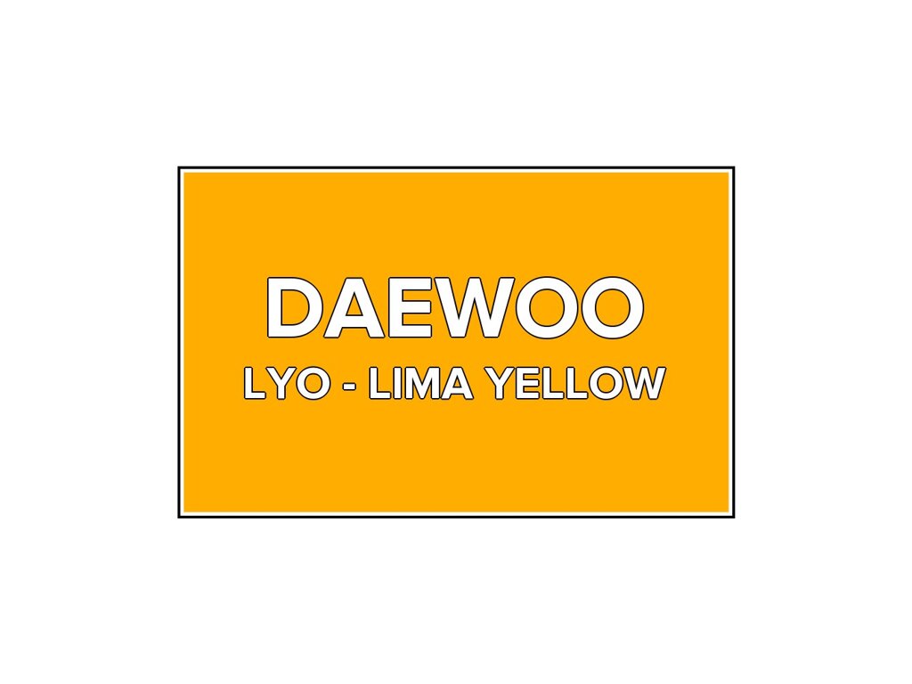 Přečíst článekŽlutá barva Daewoo LYO Lima Yellow ve spreji o objemu 400ml. Barva LIMA YELLOW přesně odpovídá autolaku LYO, používaného na vozech Daewoo v letech 1999-2001. Barva na všechny povrchy, snadná aplikace, 100% krytí.