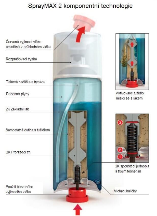 K promíchání těchto složek dojde až při prvním použití spreje. Postup aktivace 2K spreje vám přiblíží výše uvedené video. K aktivaci není potřeba žádná další speciální výbava, vše potřebné je součástí balení spreje. Samotný postup aktivace dvousložkového spreje je uveden i přímo na plechovce se sprejem.