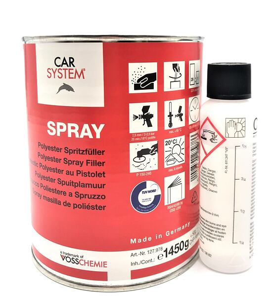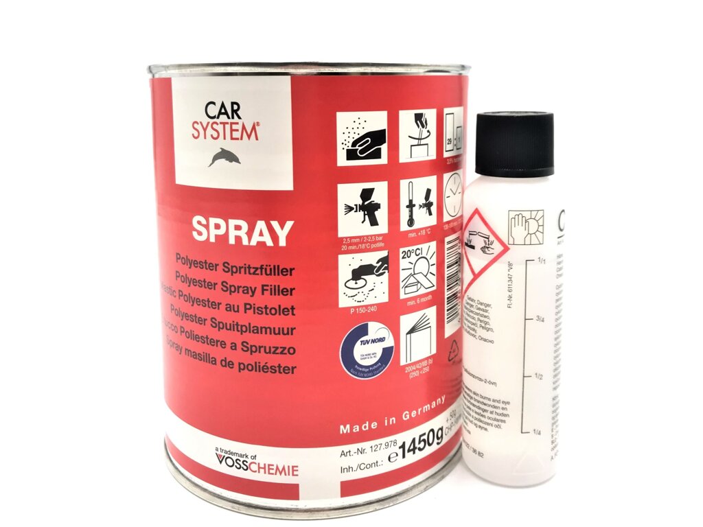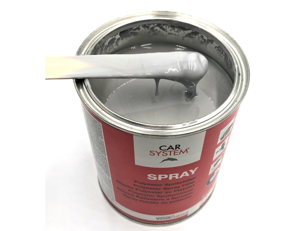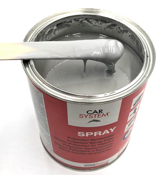 na bázi polyesterové pryskyřice je vhodný pro vyplnění nerovností, brusných stop a drobných poškození na karoserii i na konstrukčních dílech auta. Vyznačuje se hladkým povrchem (po zaschnutí) bez pórů, snadno se brousí a rychle schne. Izoluje základy a akrylové barvy od polyesterových tmelů. Stříkací tmel se využívá pro vytvoření rovnoměrných vrstev při opravě větších ploch (například kapoty, střechy, apod.).