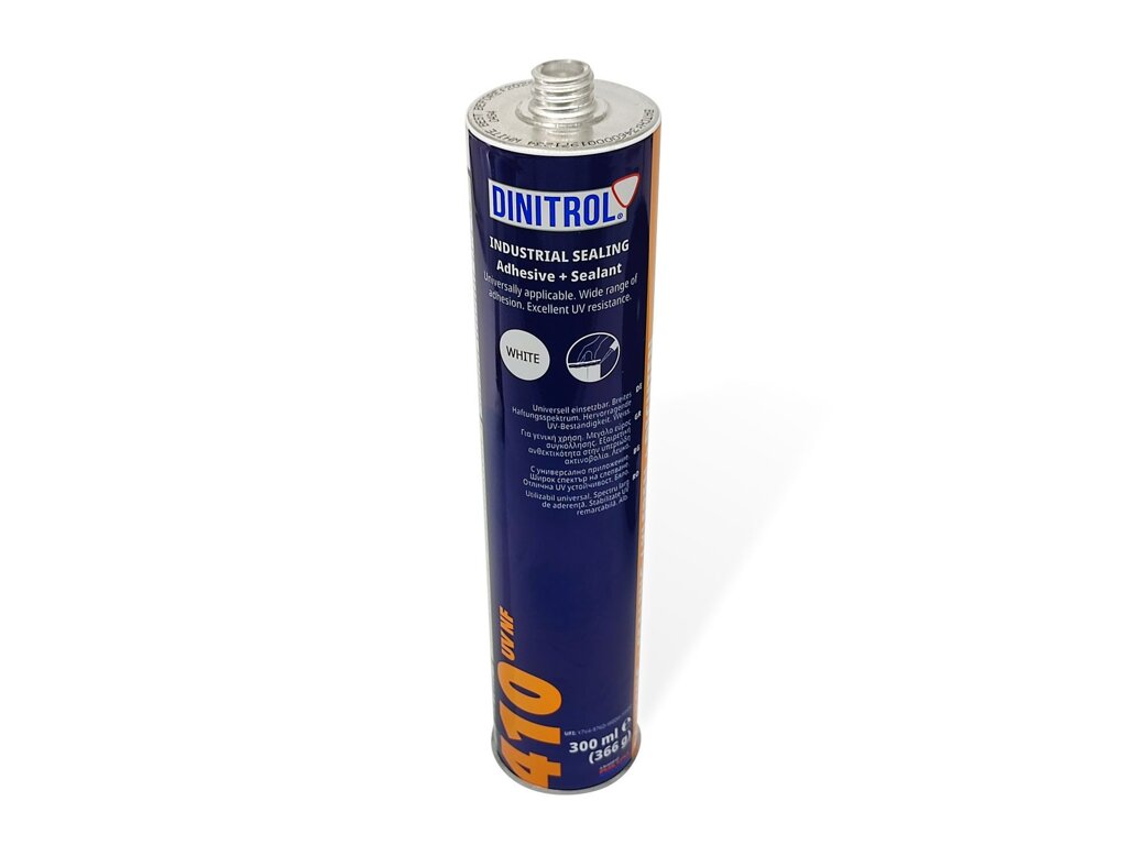 Polyuretanová lepící a těsnící hmota Dinitrol 410 UV NF má vynikající přilnavost na většinu materiálů, je rychle tvrdnoucí, v konečném stavu stále elastický a odolný proti UV záření.