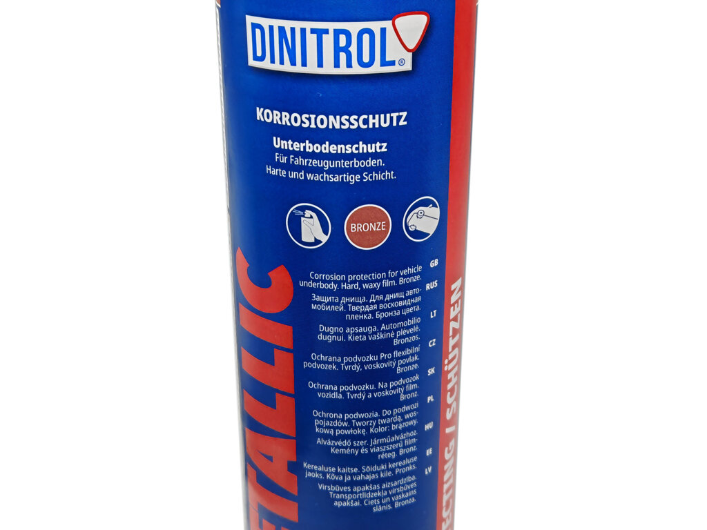 DINITROL METALLIC je výrobek určený k ošetřování podvozku vozidel během výroby, u importérů, i v poprodejním servisu. Dinitrol výborně přilne jak k lakovanému povrchu, tak i k povrchu opatřenému vrstvou PVC nebo podobného materiálu. Výrobek nenarušuje zinek, gumu ani plastické hmoty. DINITROL METALLIC je též velmi vhodný jako ochrana proti korozi během transportu a skladování za extrémních podmínek. Výsledný povrch je nepřelakovatelný.