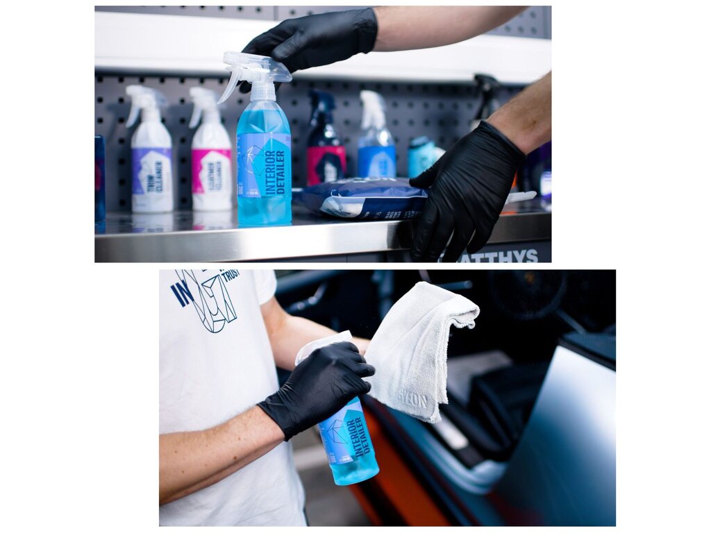 Gyeon Q2M Interior Detailer je bezpečný pro kůži, plasty, Alcantaru, textil, sklo a všechny typy vnitřního obložení. Na vyčištěných površích zanechává matný, nelepivý povrch.