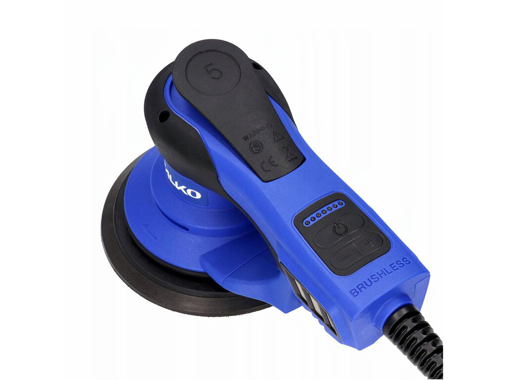 Orbitální bruska je vybavena kotoučem se suchým zipem o průměru 150 mm s odsáváním prachu. Velikost oscilace kotouče je 5 mm, takže jde práce rychle od ruky při broušení i leštění.