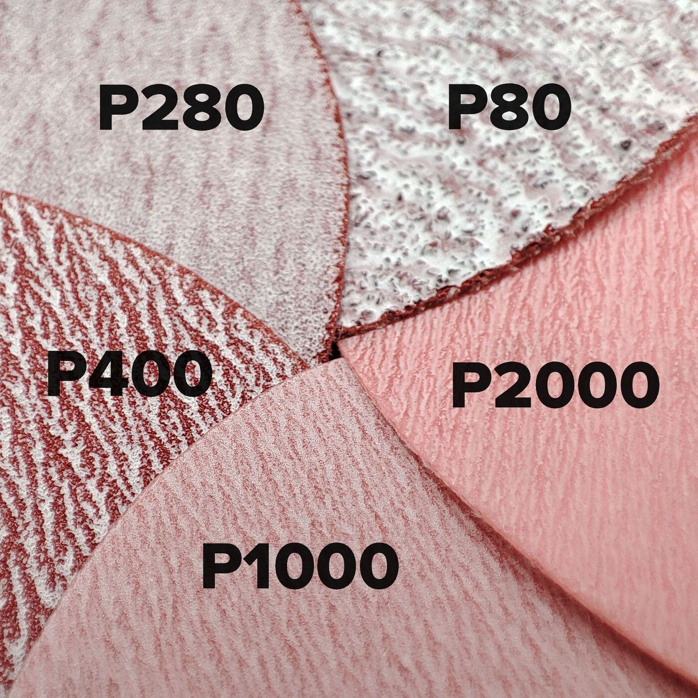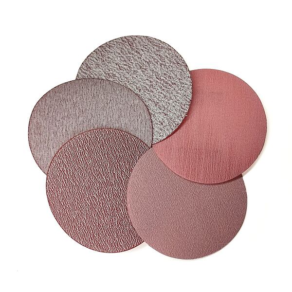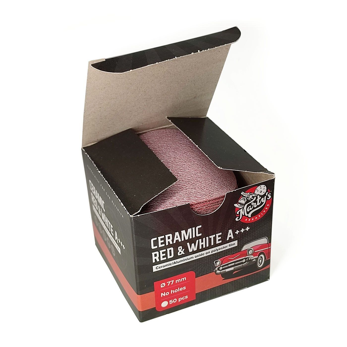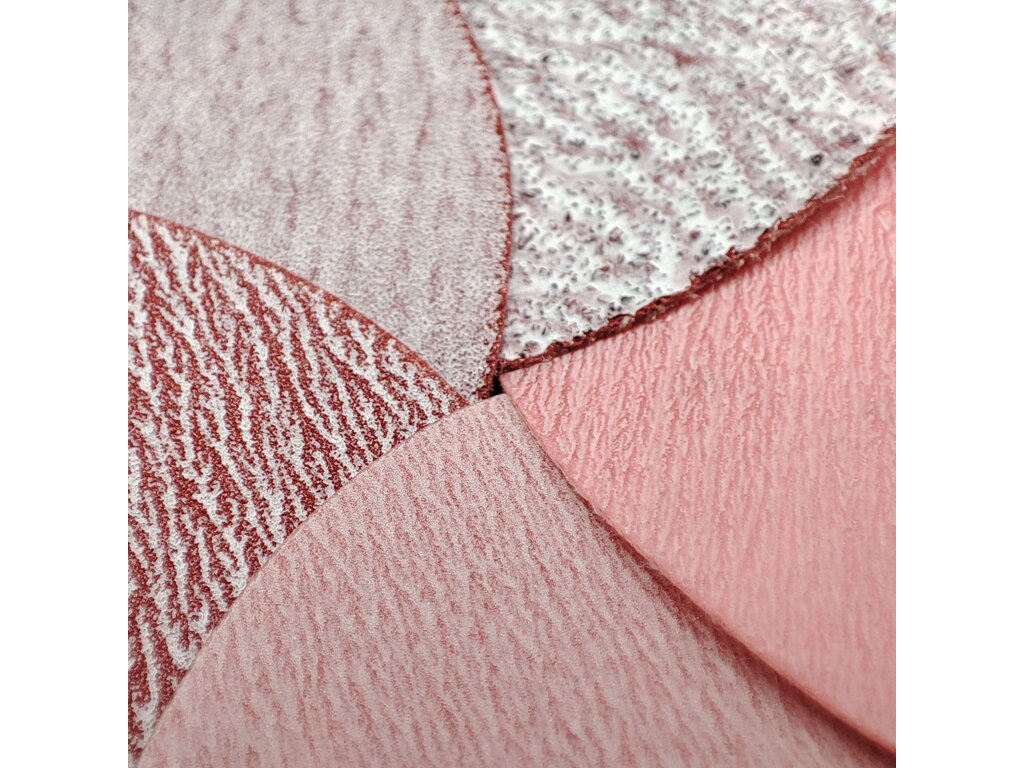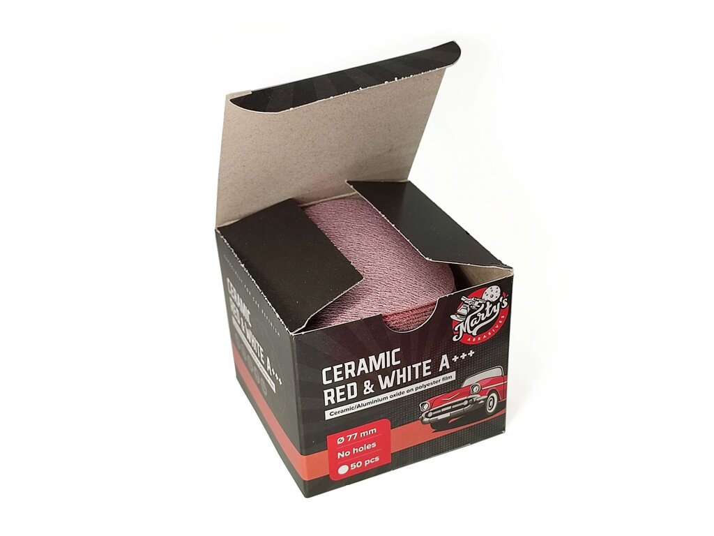Marty's Ceramic Red&White pe discuri P240 cu diametrul de 75 mm combină granulația ceramică cu granulația de oxid de aluminiu, plasate împreună pe un suport de folie.