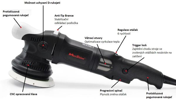 navržena pro co nejefektivnější a nejjednodušší leštění. Stroj je upgradován opěrnou vzpěrou proti převrácení při odložení leštičky. Snadno odstraňuje škrábance, oxidace a další poškození laku.