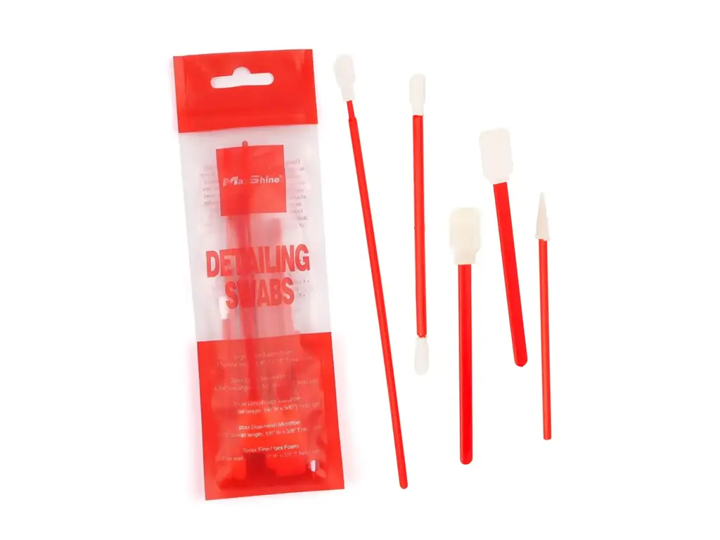 Výběr pěti různých druhů detailingových tyčinek z mikrovlákna nebo pěny. Různé tvary a velikosti dovolují vyčistit všechny drobné zákoutí a složité tvary v automobilech, jako jsou zásuvky, lemování palubní desky, reproduktory, výdechy klimatizace, ale i venkovní části znaků automobilů atd.