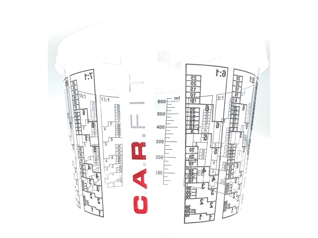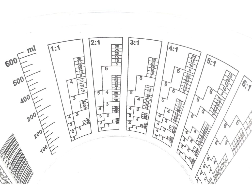 Na pohárkách jsou použity odolné tištěné grafické informace a měřítka, díky kterým je možné míchat materiály s objemovými poměry 2:1, 3:1, 4:1, 5:1, 6:1, 7:1 až 10:1. Dále míchací kelímky obsahují obecné měřítko.