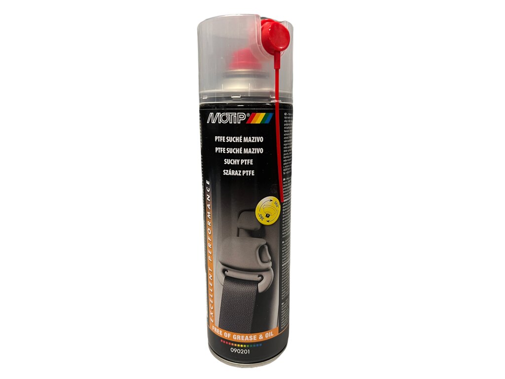 Motip PTFE Suché mazivo ve spreji na suché povrchy kovových a plastových mechanických částí. Má nízký koeficient tření. Vhodné jako prostředek podporující odlepování forem, kde není možné použít silikon. Po nanesení a odpaření rozpouštědla zůstane suchý ochranný PTFE film.