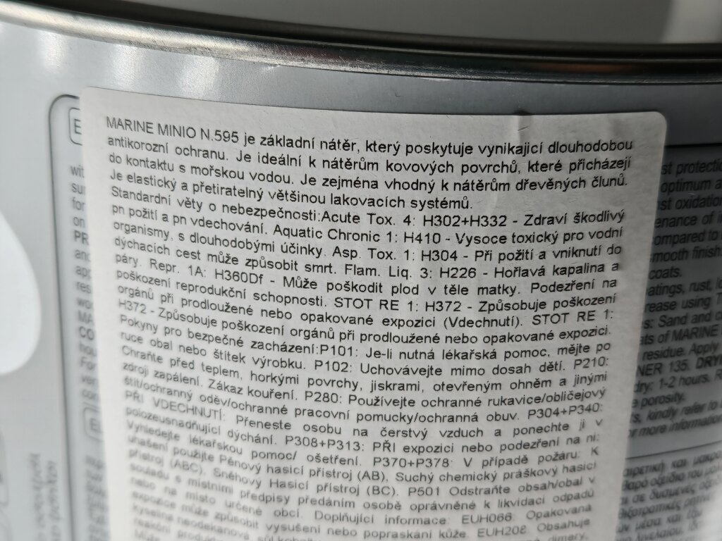 Signální slovo:Nebezpečí.H360Df Může poškodit plod v těle matky. Podezření na poškození reprodukční schopnosti. H302+H332 Zdraví škodlivý při požití nebo při vdechování. H372 Způsobuje poškození orgánů při prodloužené nebo opakované expozic. H304 Při požití a vniknutí do dýchacích cest může způsobit smrt. H410 Vysoce toxický pro vodní organismy, s dlouhodobými účinky. EUH201 Obsahuje olovo. Nemá se používat na povrchy, které mohou okusovat nebo olizovat děti. EUH208 Obsahuje: BIS(2-ETHYLHEXANOÁT) KOBALTNATÝ 2-BUTANONOXIM může vyvolat alergickou reakci. Pouze pro profesionální uživatele. Pokyny pro bezpečné zacházení: P201 Před použitím si obstarejte speciální instrukce. P273 Zabraňte uvolnění do životního prostředí. P280 Používejte ochranné rukavice / oděv a ochranné brýle / obličejový štít. P301+P312 PŘI POŽITÍ: necítíte-li se dobře, volejte TOXIKOLOGICKÉ INFORMAČNÍ STŘEDISKO / lékaře / . . . P304+P340 PŘI VDECHNUTÍ: přeneste osobu na čerstvý vzduch a ponechte ji v poloze usnadňující dýchání. Obsahuje: PEROXID OLOVA TĚŽKÁ FRAKCE NAFTY DESULFUROVANÁ VODÍKEM