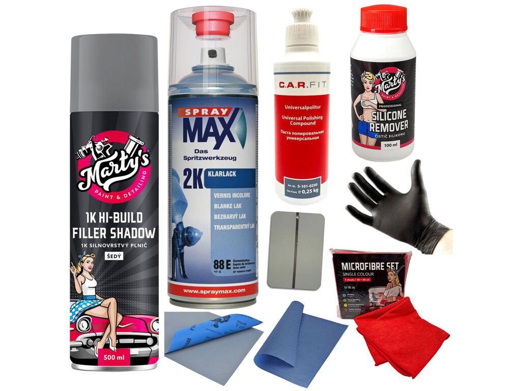 Získáte tu navíc mimořádně odolný dvousložkový čirý lak SprayMAX na finální vrstvu metalízy a leštící pastu s kvalitní mikrovláknovou utěrku pro dokonalé finální rozleštění opraveného místa.