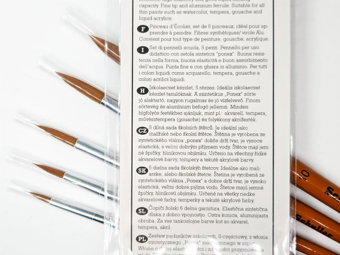 Kompletní sada pěti malých štětců od velikosti 2 do velikosti 10. Štětce mají štětiny z kvalitního syntetického vlákna Ponex.