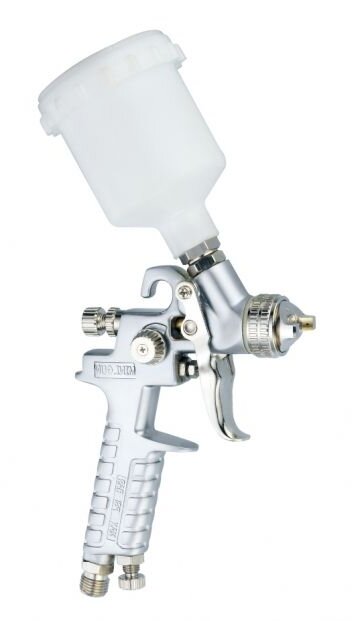 U pistole lze regulovat množství vzduchu, barvy a také tvar kužele. Připojení přes rychlospojku. Vhodná pro aplikaci laku (na vodní i rozpouštědlové bázi), vrchních barev, tmelů a plničů.